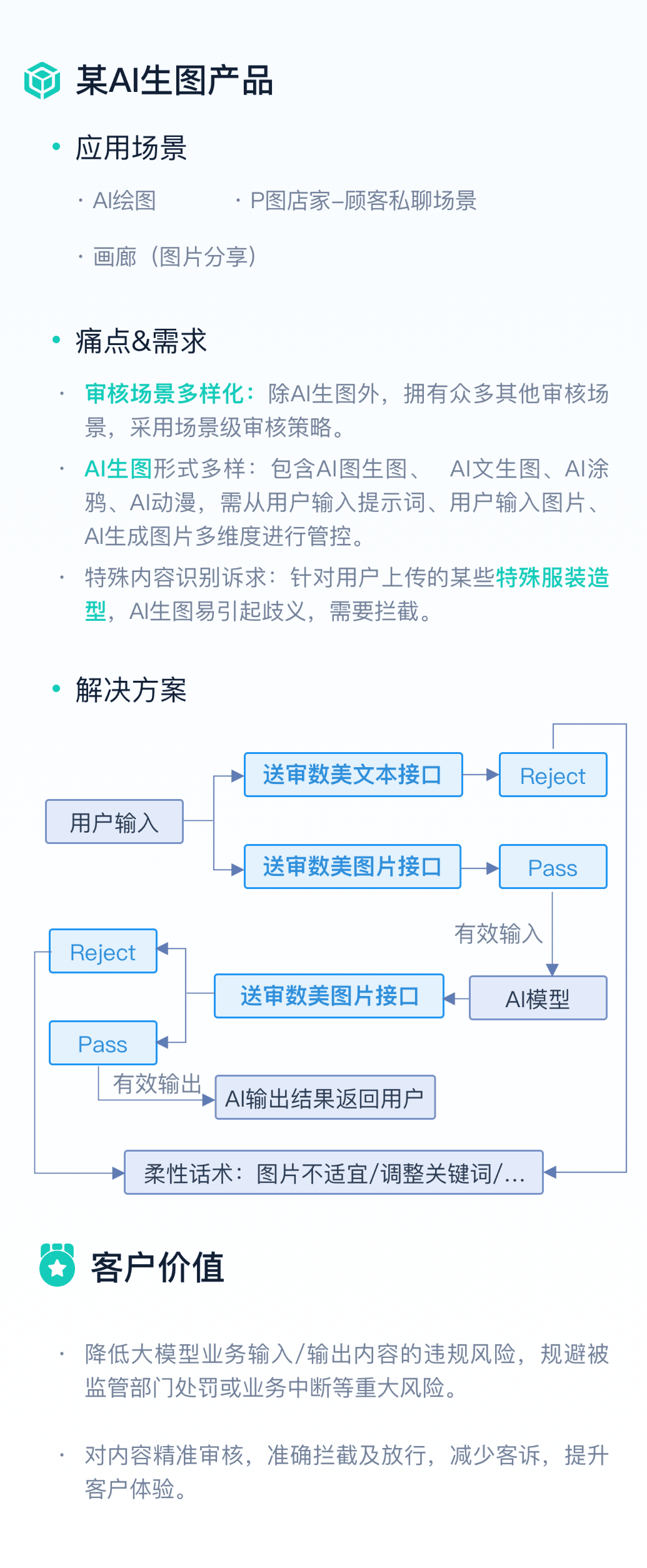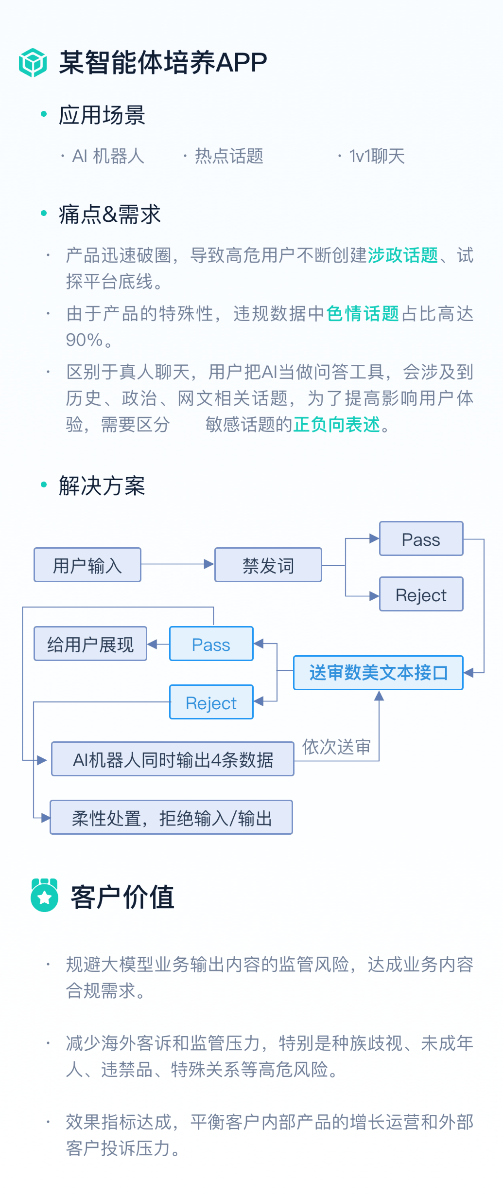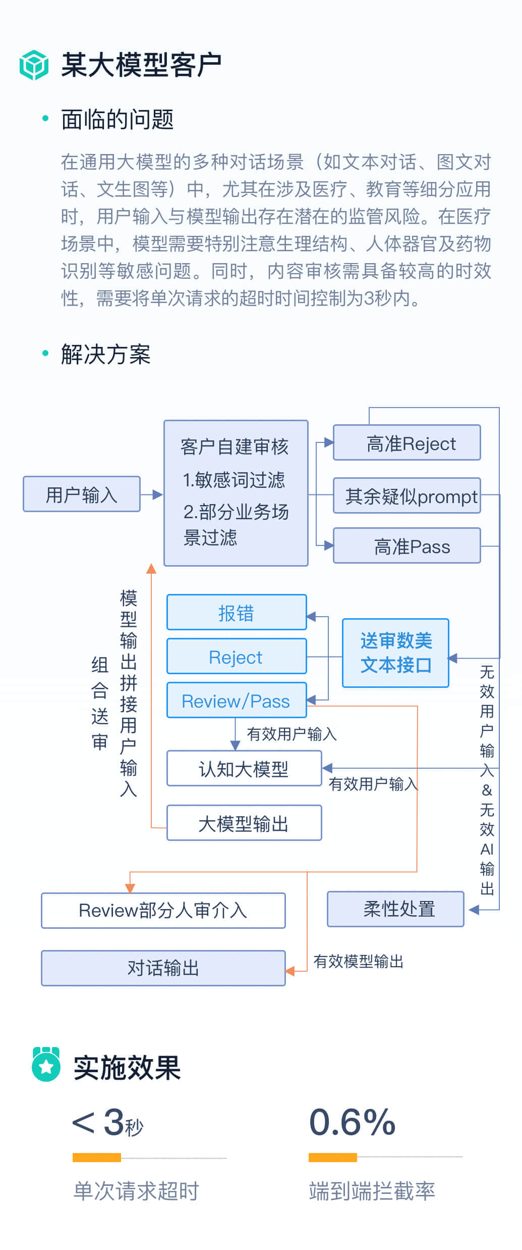 对大模型输入、输出内容进行语义正负向分析,有效降低误杀,提升用户体验。