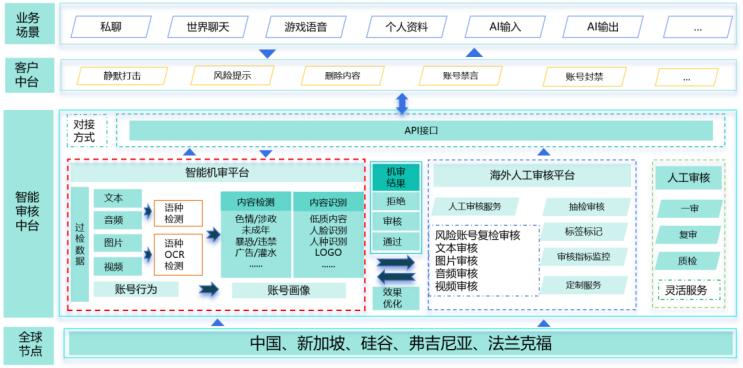 数美构建了一套完善的内容合规系统架构,通过AI技术对游戏中的各种内容进行审核和管理。方案架构分为三层:业务场景、客户中台和审核中台。
