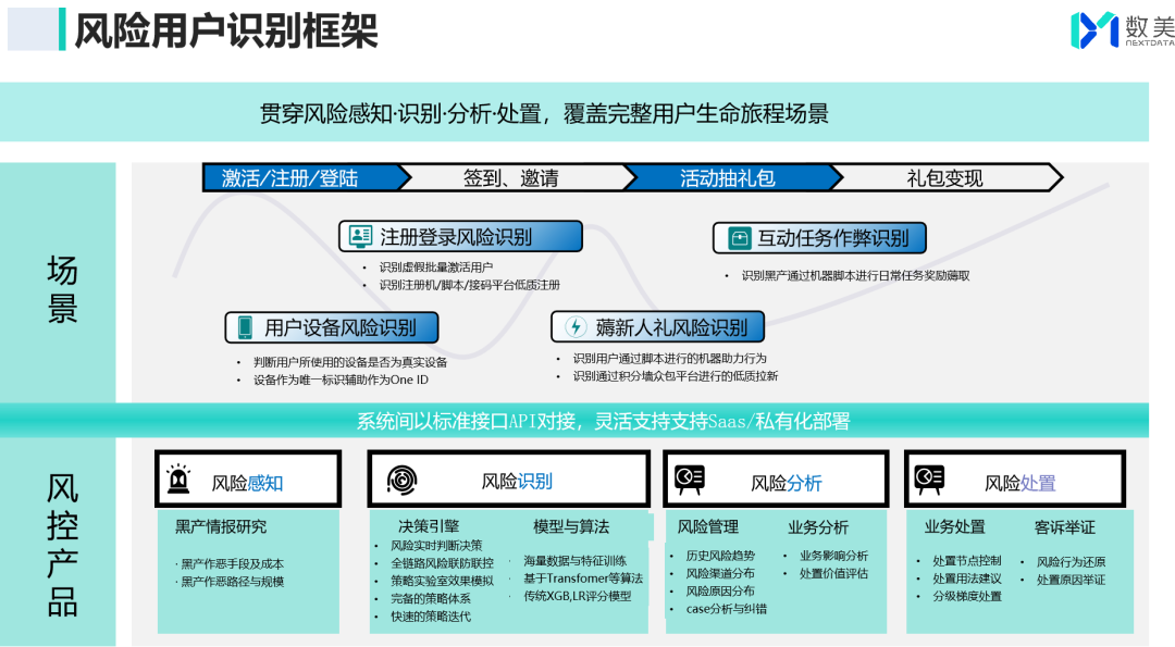 数美提供从风险感知,风险识别,风险风险和风险处置建议等全流程的风控方案。通过全路径布控,在用户激活、注册、登录、做任务、提现等各个环节接入事件布控,覆盖用户完整生命旅程场景,实时判断用户在不同阶段的风险。
