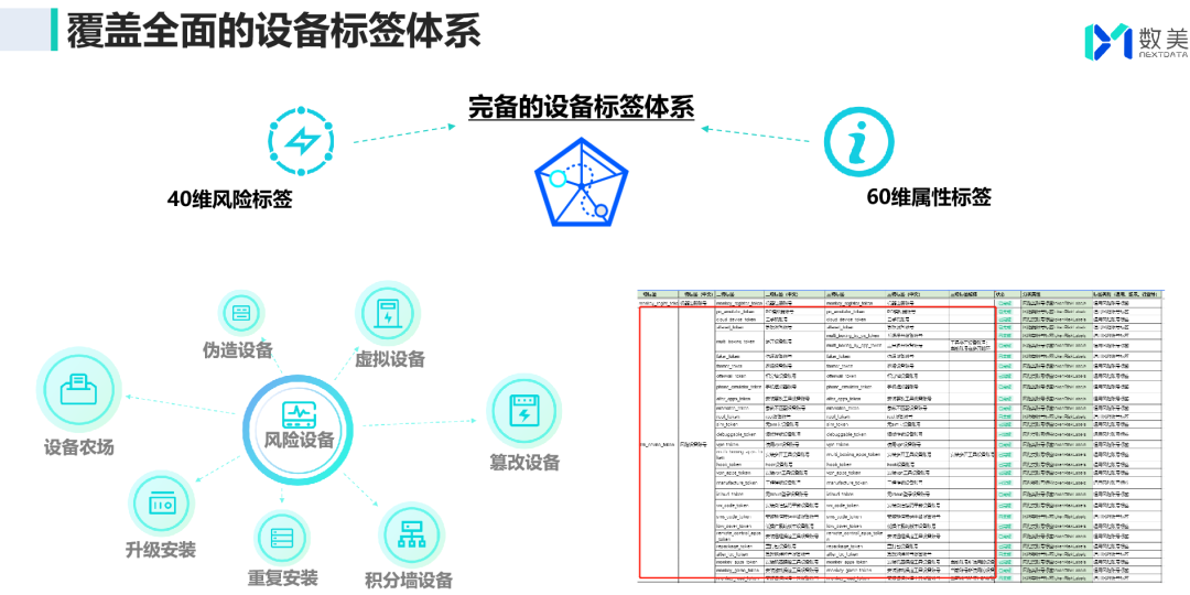 (3)设备风险识别:设备是黑产作恶最主要的成本,数美建立了完备的设备标签体系,通过60+维度的属性标签和40+维度风险标签,对设备风险进行全面分析,识别刷机、篡改等异常设备以及模拟器/虚拟机、设备农场、云手机等虚拟设备环境的能力,这些设备往往被黑产用于批量操作和隐藏真实设备特征。通过精准识别这些设备风险,提高黑产作恶成本。