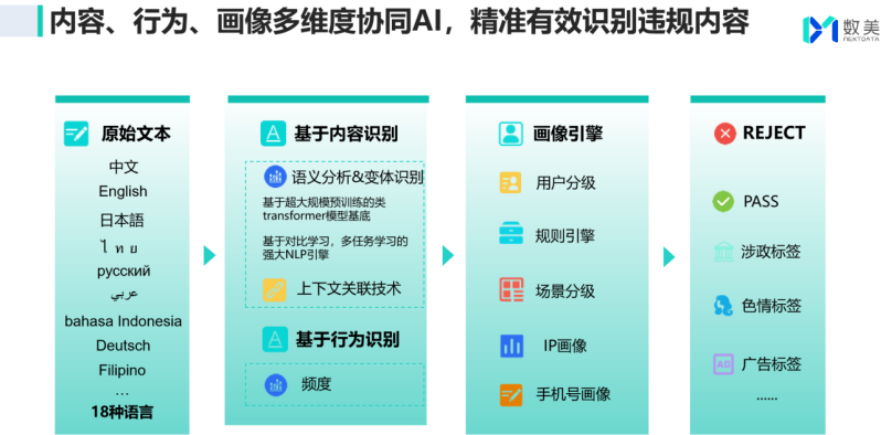 (2)覆盖全球18种语言 :数美的服务已覆盖欧洲、北美、南美、非洲、中东、东南亚、印度等全球上百个国家和地区,支持18种全球主流语种的文本内容审核,覆盖全球90%人口常用语言,在为国内社交、游戏等多个行业的出海头部客户的服务实践中积累丰富的经验。