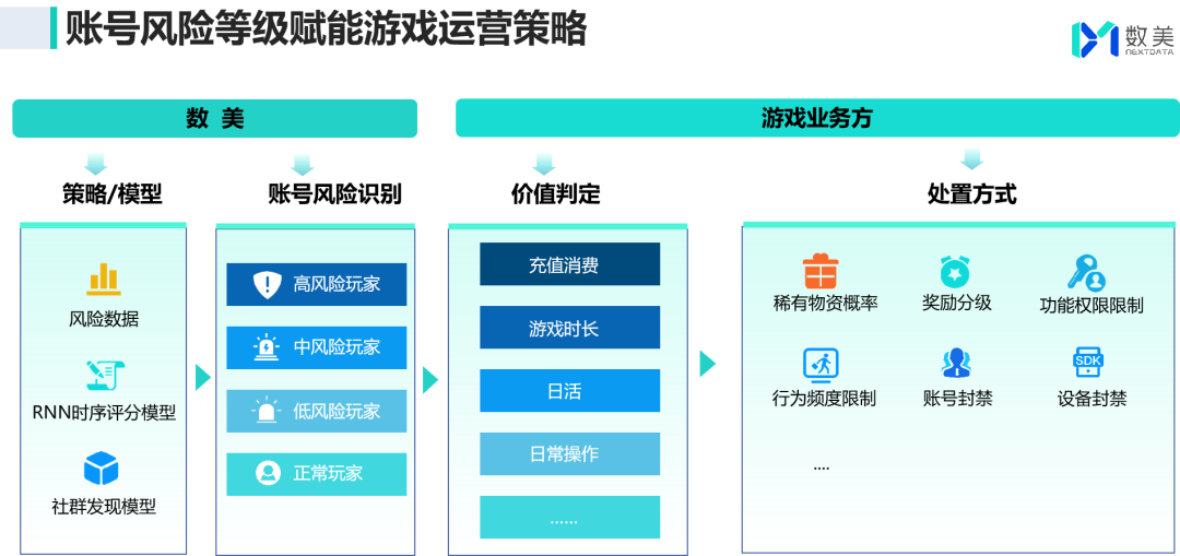 除此之外,在游戏运营中,数美通过对账号风险等级的划分,赋能游戏运营策略。数美通过风险数据、RNN时序评分模型和社群发现模型来区分高、中、低风险玩家以及正常玩家。游戏平台根据风险等级,结合玩家的充值消费、游戏时长等业务数据和行为进行价值判定,从而采取相应的处置方式,如调整稀有物资概率、奖励分级、功能权限限制、行为频度限制、账号封禁和设备封禁等,以此来优化游戏运营,提升用户体验和保障游戏环境的安全。