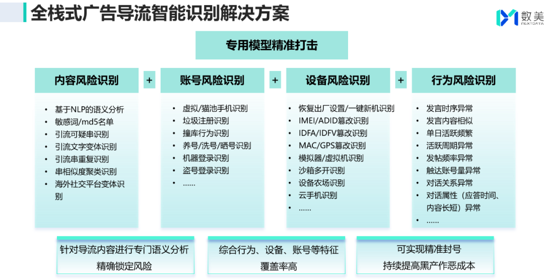而广告导流风险大部分是由黑产团伙组成的,采用批量账号发送引流信息,目标是通过挖取用户而获利,所以要解决广告的问题通过单纯内容是不能从根本上解决问题,必须通过多个维度把挖人的账号识别出来并处置才能解决,所以它的本质是风险账号的识别。数美的方案通过专用模型对挖人黑产的设备、行为、内容、账号等风险进行综合识别,给挖人账号打上标签返回给客户进行接禁言、封禁账号等处置措施,精准打击导流黑产。