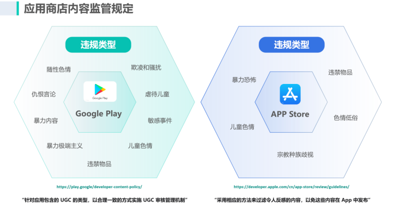 (1)违规内容:游戏出海首先要解决应用商店的内容合规问题, Google Play和App Store两大主要应用商店,对色情、暴恐、违禁、宗教种族歧视、未成年人等都有相应的规范要求,出现相关违规内容可能导致应用被下架。