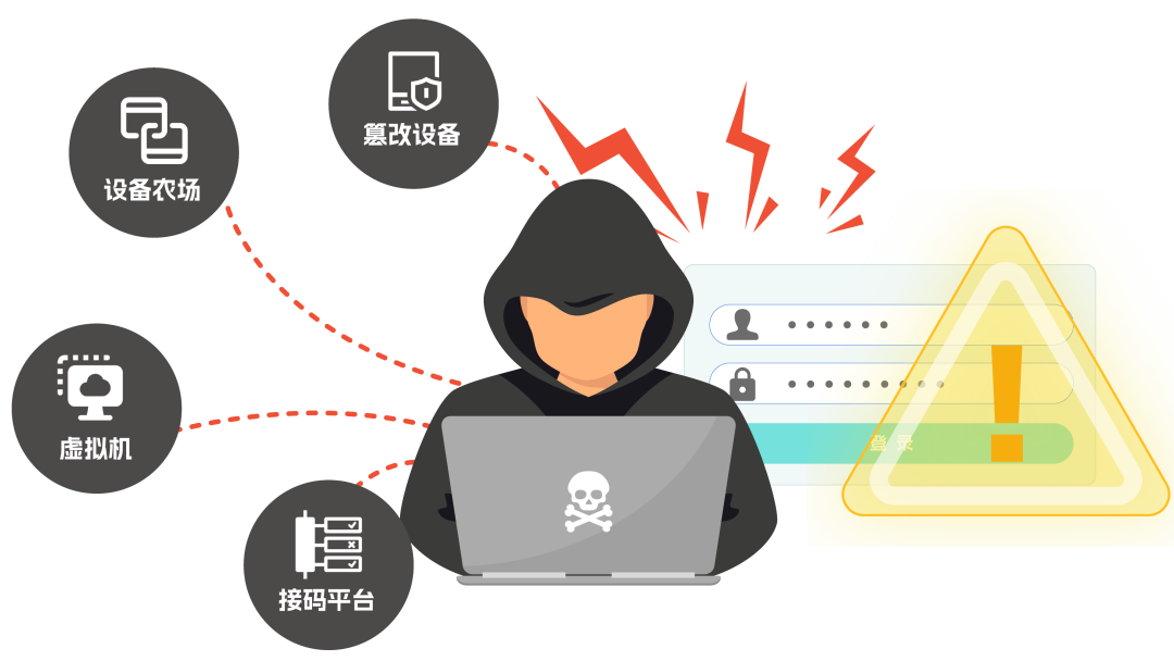 黑产使用一键新机、一键篡改等工具修改设备硬件参数(IMEI、MAC地址、GPS定位等),结合云手机、虚拟机技术,将单台设备虚拟化为数百台“新设备”,实现批量注册。