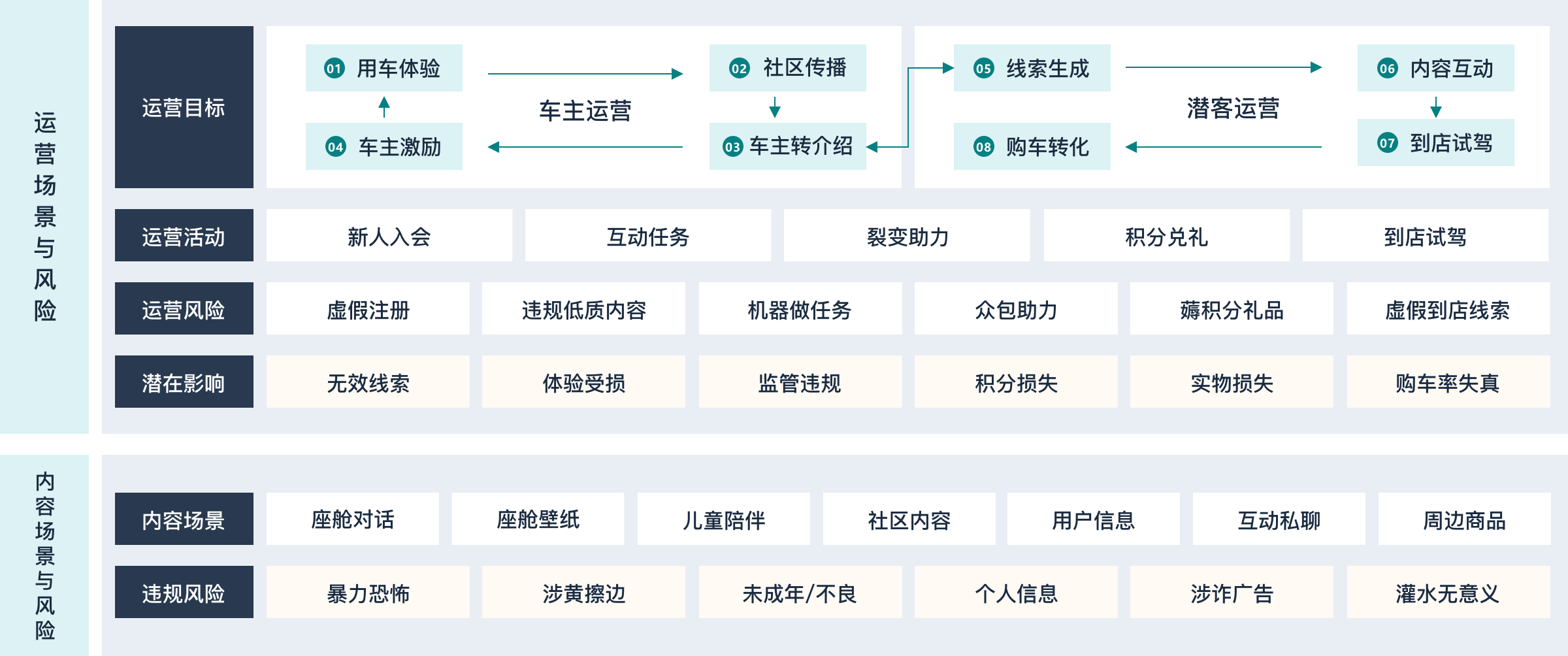 从潜客线索生成开始,到内容互动、任务互动、到店试驾、购车转化等潜客运营各阶段进行风险识别和处置运营,重点运营有效线索,促进转化