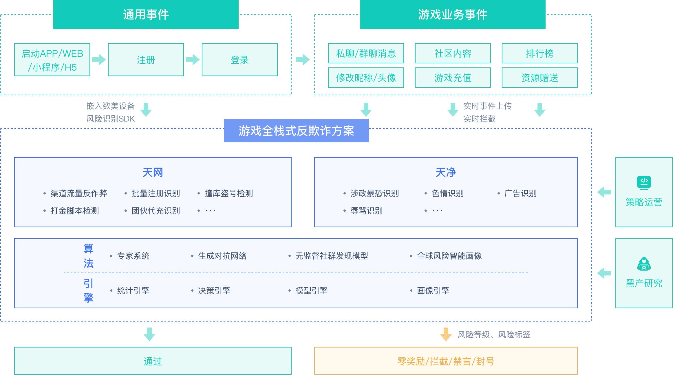 除传统的业务风控需求外,提供专供游戏行业场景的GS挖金主识别、游戏外挂识别、黑产工作室打金识别、代充退款识别等业务风控功能